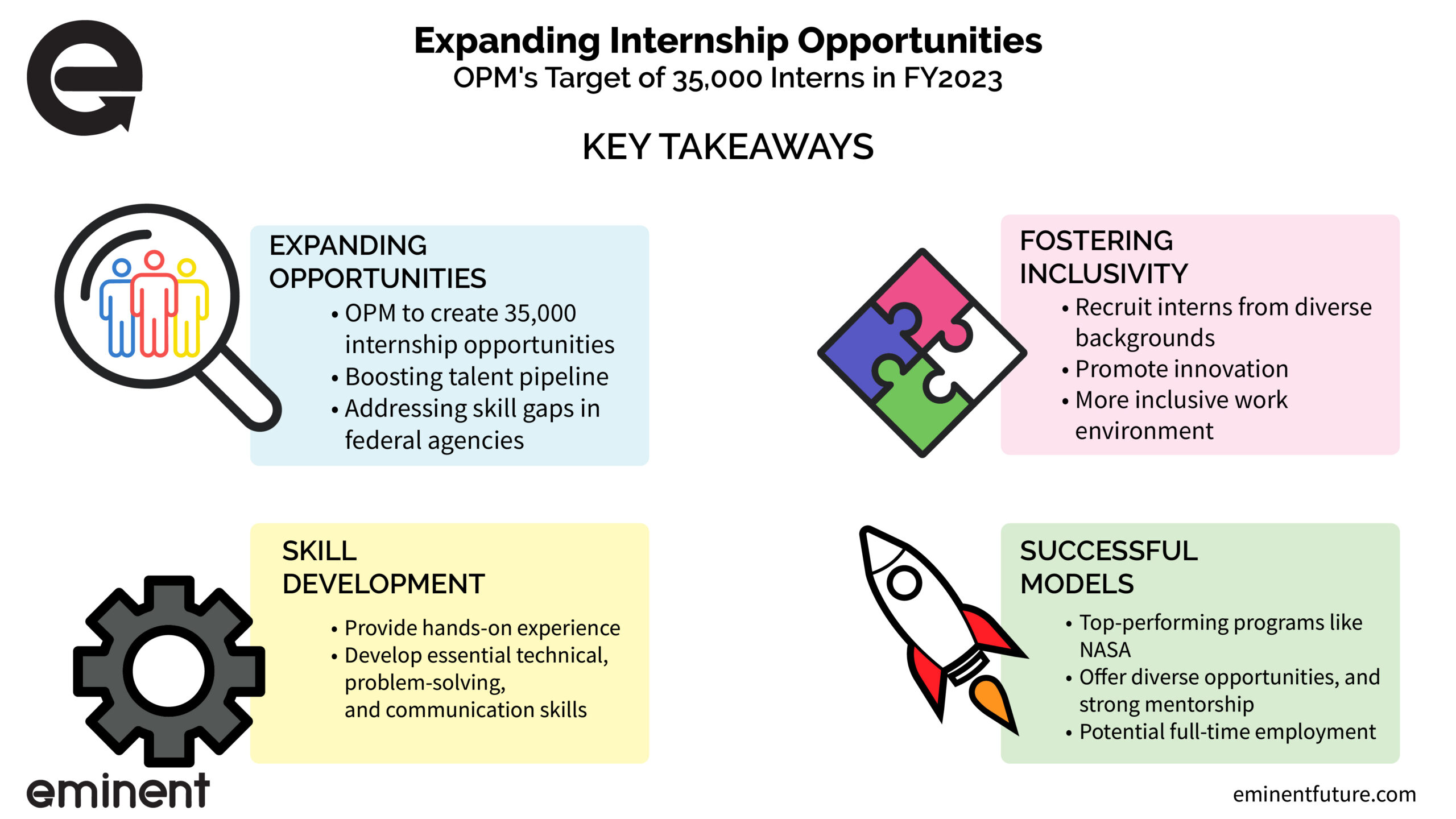 In conclusion, the new guidance from OPM highlights the importance of internships in the federal sector, aiming to create 35,000 internship opportunities in FY2023. By offering internships, federal agencies can foster skill development, build a robust talent pipeline, and promote diversity and inclusion in their workforce.