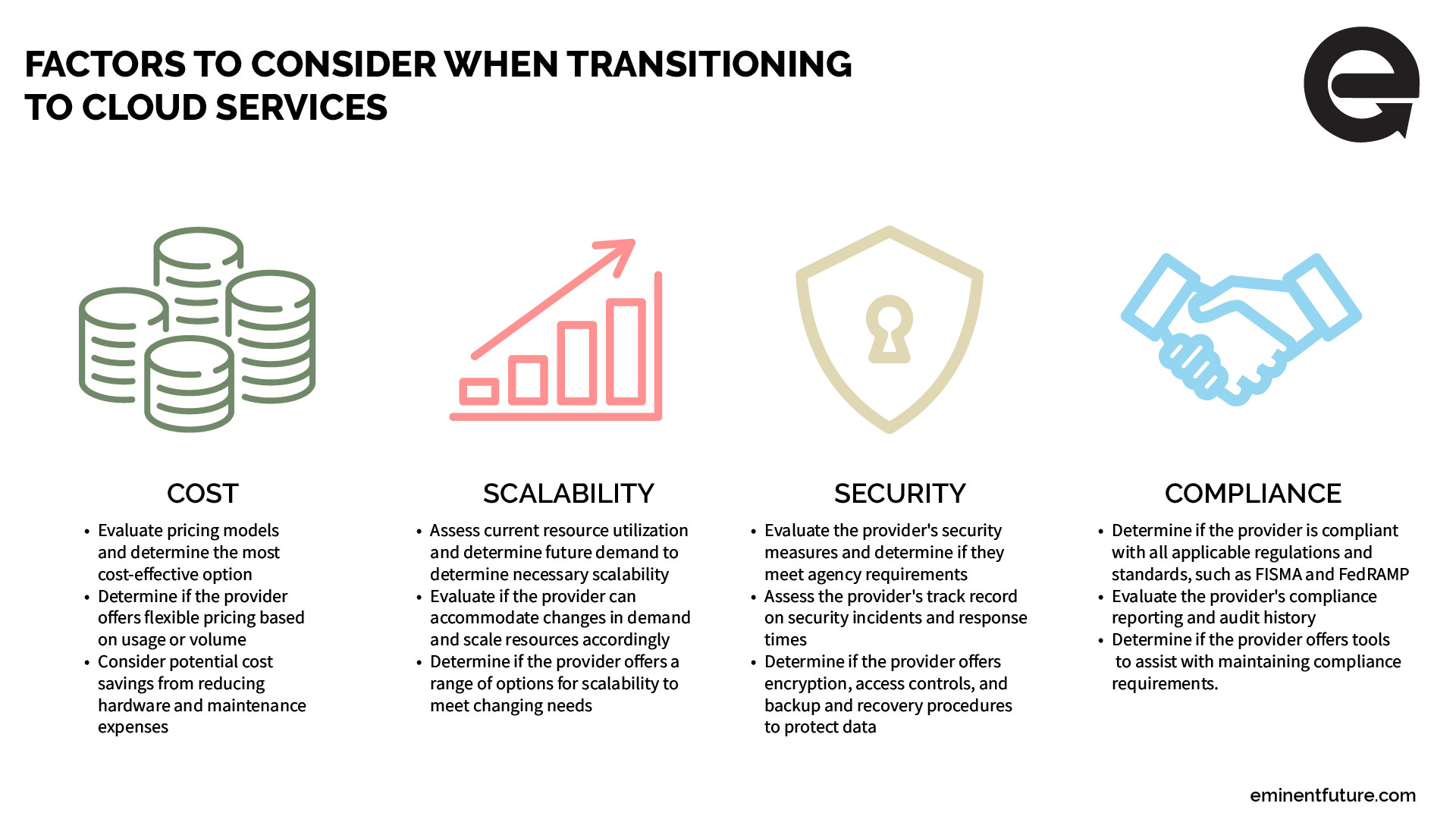 However, federal directors must consider several critical factors before switching, such as assessing existing IT infrastructure, researching vendors, evaluating security and compliance requirements, and ensuring integration with existing systems. By taking a proactive approach and carefully considering these factors, federal agencies can achieve a successful transition to cloud services.