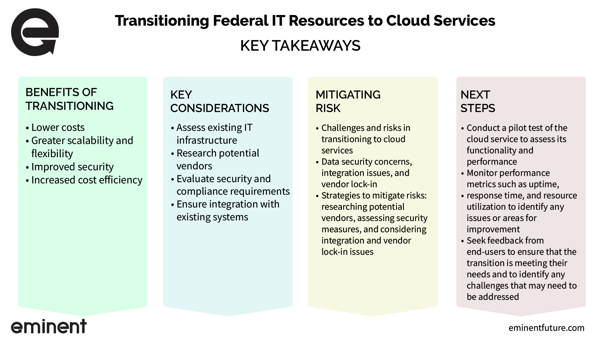 With the right approach, transitioning to cloud services can help federal agencies unlock the full potential of their IT resources and improve operational efficiency while keeping costs low. We encourage readers to consider the benefits of cloud services and take the necessary steps to make the switch.